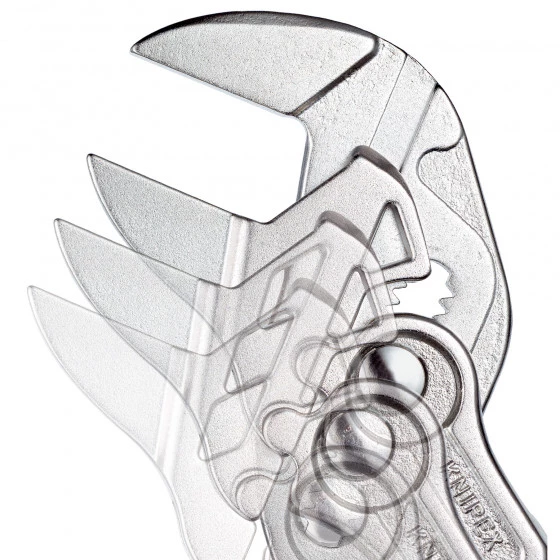 Remplace tout un jeu de clés plates, métriques et en pouces. Mâchoires lisses ménageant les robinetteries chromées au montage!. Convient aussi parfaitement pour saisir, tenir, presser et mettre en forme. Mâchoires lisses ménageant les robinetteries chromées au montage!. Pas d’endommagement des bords des robinetteries chromées grâce à une pression des mâchoires sans jeu. Réglage rapide à même la pièce par simple pression du bouton. Pas de déréglage accidentel des mâchoires ni de glissement de la charnière. Remplace tout un jeu de clés plates, métriques et en pouces. Saisie sans à-coup de toutes les largeurs jusqu’à la capacité maximale indiquée grâce à ses mâchoires parallèles. La course entre les mâchoires permet un serrage et un desserrage rapide selon le principe du cliquet. Force de serrage élevée grâce à une transmission de force manuelle multipliée par 10. Acier électrique au chrome-vanadium, forgé, trempé à l’huile.